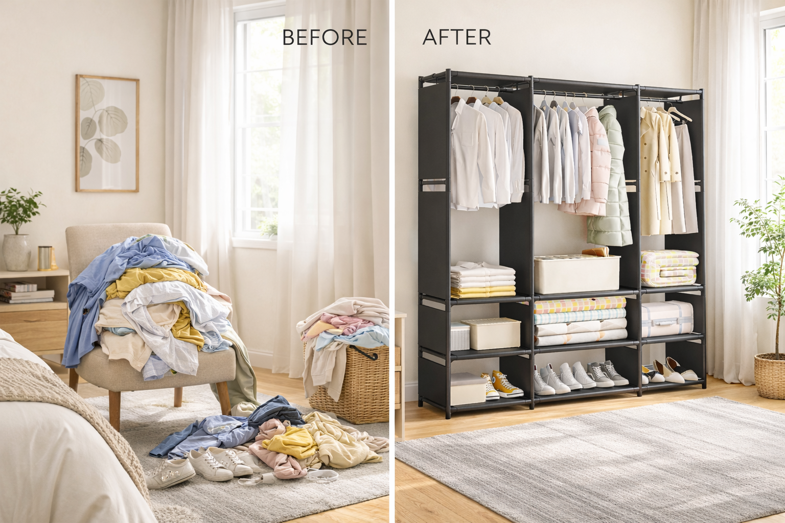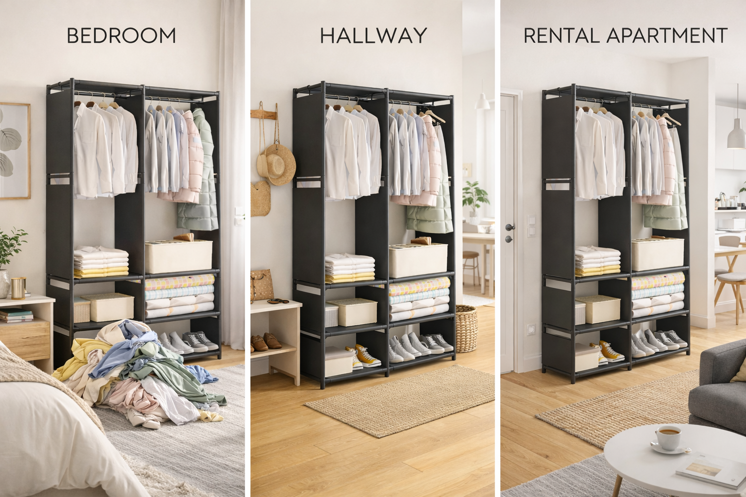 Grazie alla sua struttura aperta, consente di avere sempre i vestiti a portata di mano, migliorando l’organizzazione quotidiana e riducendo il disordine. È perfetto come armadio per camera da letto, guardaroba per piccoli appartamenti, armadio per affitti, case vacanza, B&B e stanze studenti.