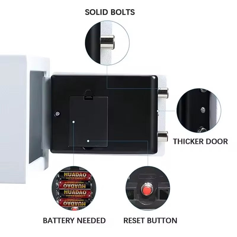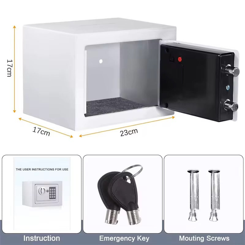 Proteggi i tuoi oggetti più preziosi con la nostra Cassaforte Digitale in Acciaio, la soluzione ideale per casa, ufficio o hotel. Grazie al suo design compatto e robusto, questa cassaforte offre una protezione affidabile contro il furto, permettendoti di custodire contanti, gioielli, documenti importanti e dispositivi elettronici in totale tranquillità.