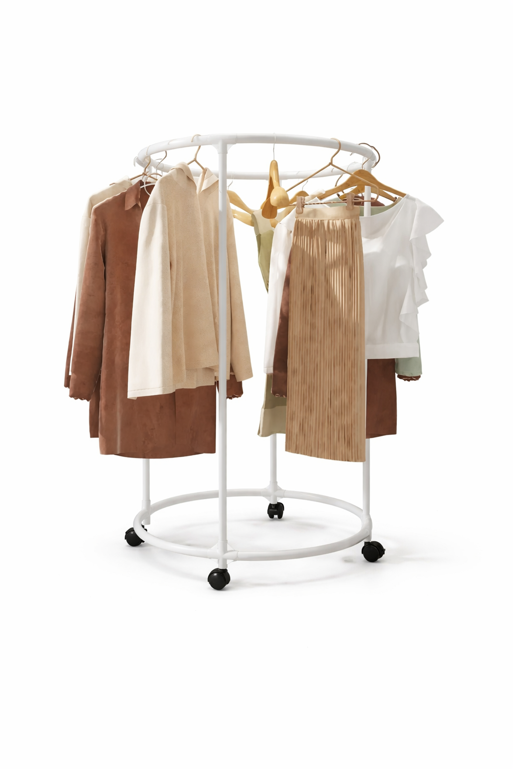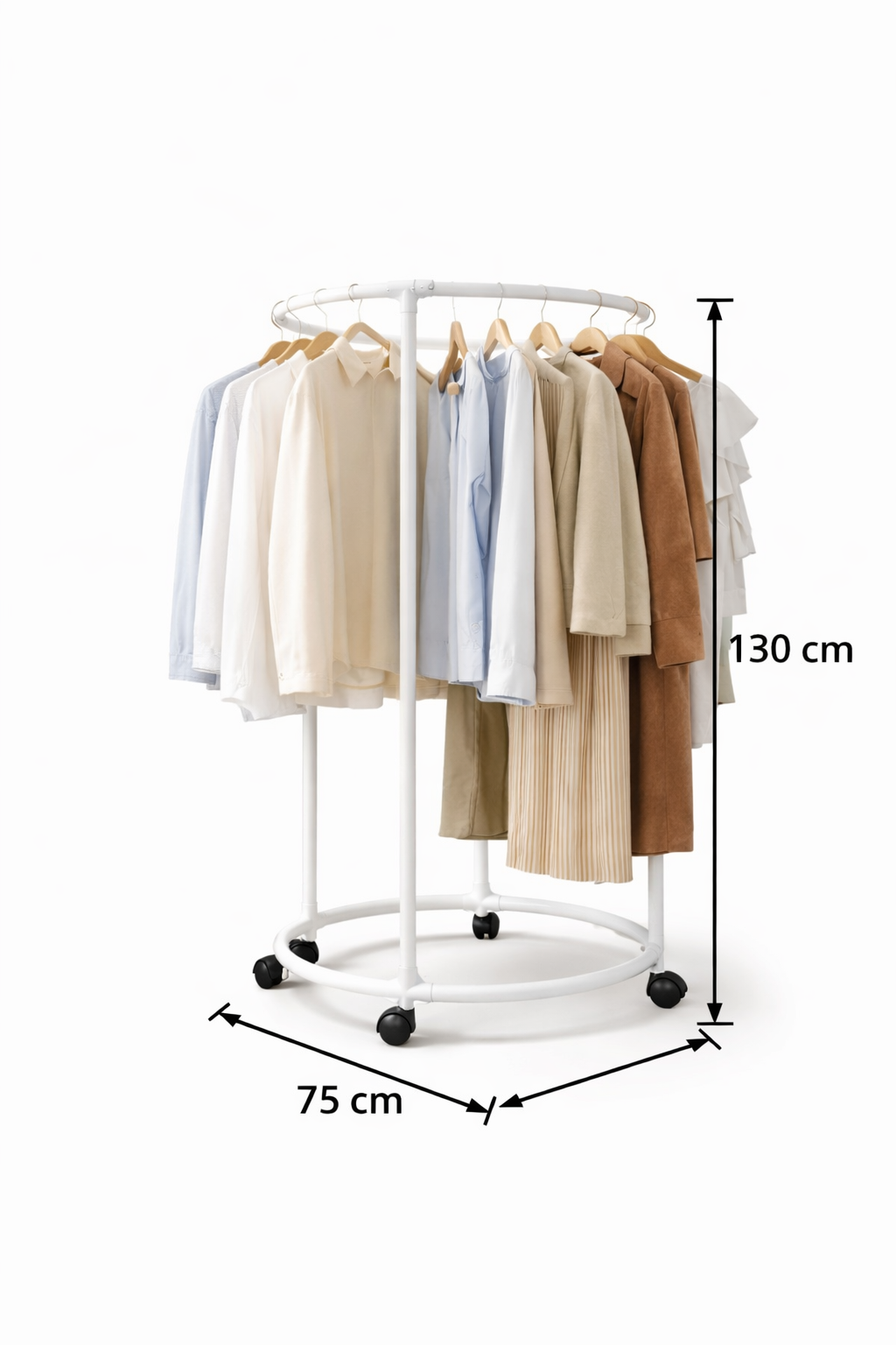 Il porta abiti circolare con ruote colore bianco è una soluzione moderna e funzionale per organizzare i tuoi vestiti in modo pratico ed elegante. Grazie al suo design rotondo salvaspazio, questo appendiabiti permette di appendere numerosi capi mantenendo l’ambiente ordinato e minimalista.