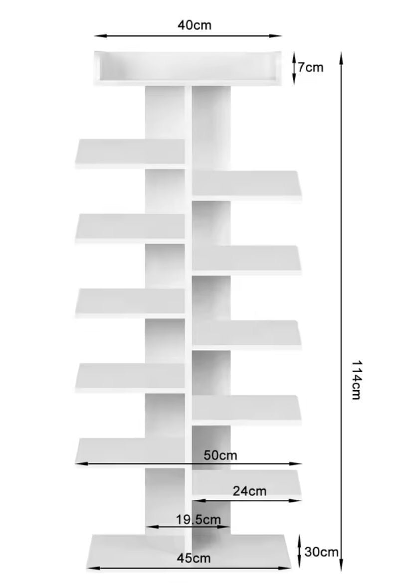 • Design Unico e Moderno: La forma a scaffale a zig-zag o scarpiera ad albero non è solo un elemento d'arredo di design, ma massimizza la capacità di stoccaggio in uno spazio ridotto.