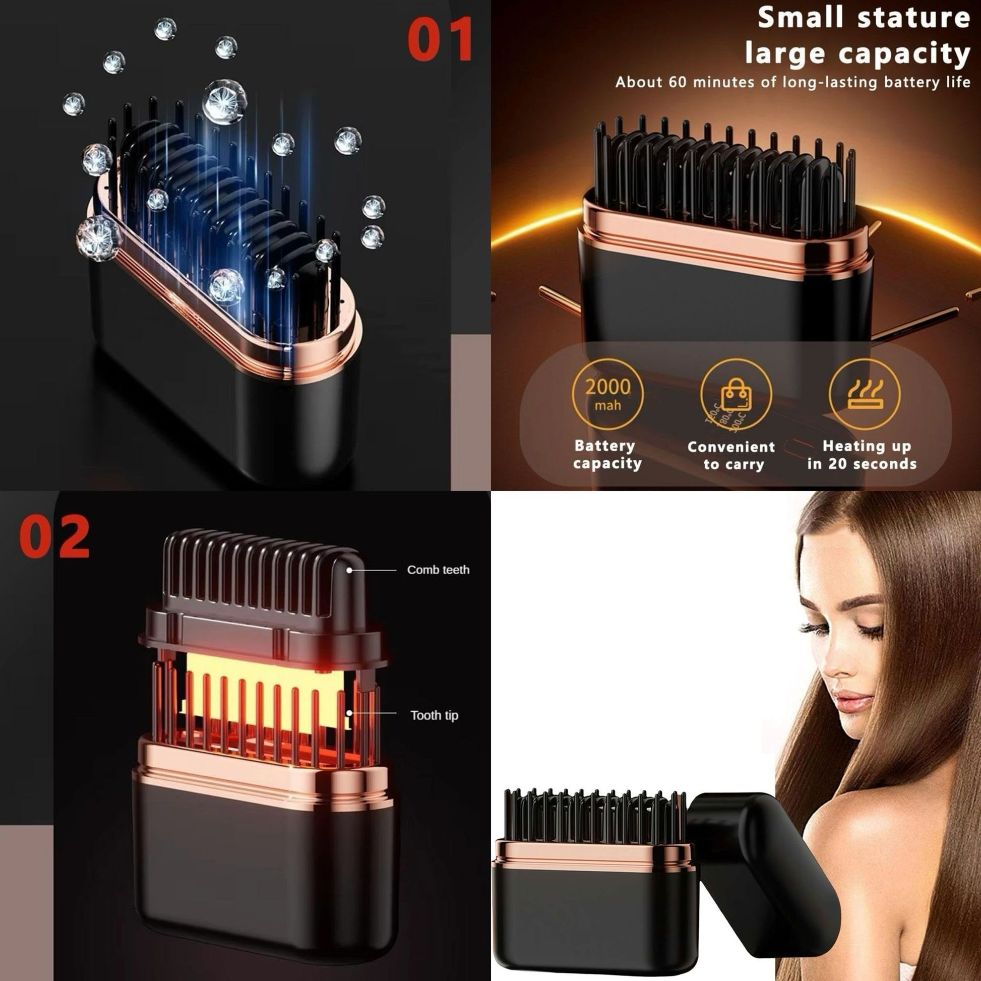 Ottieni capelli lisci e morbidi in pochi minuti con la nostra spazzola lisciante senza fili, pratica, compatta e perfetta da portare sempre con te. Grazie alla sua tecnologia innovativa, questo pettine elettrico ricaricabile combina la funzione di una piastra con la comodità di una spazzola, garantendo un liscio naturale e duraturo senza rovinare i capelli.