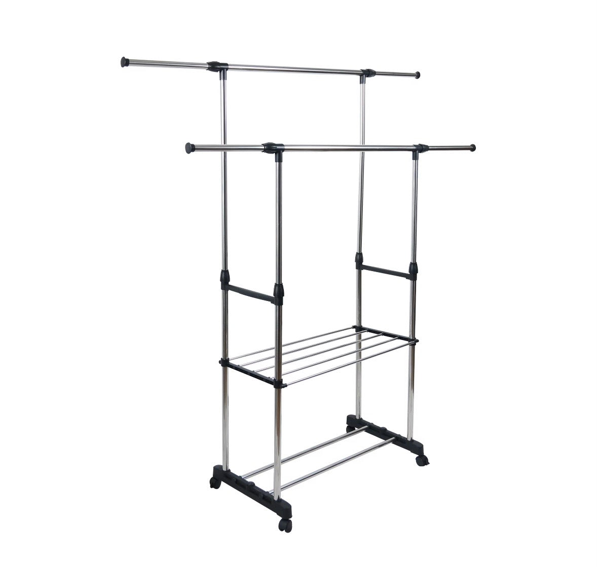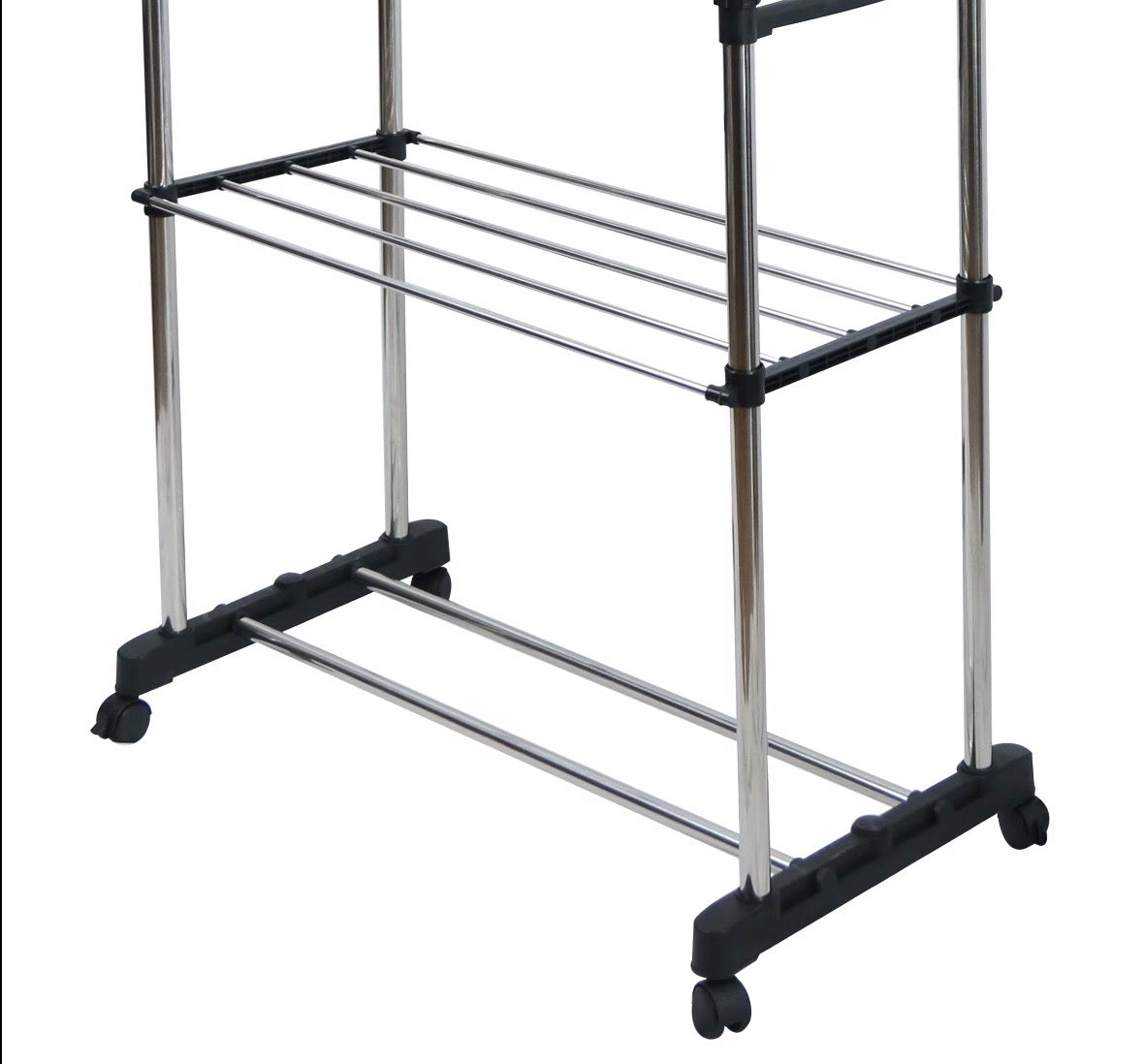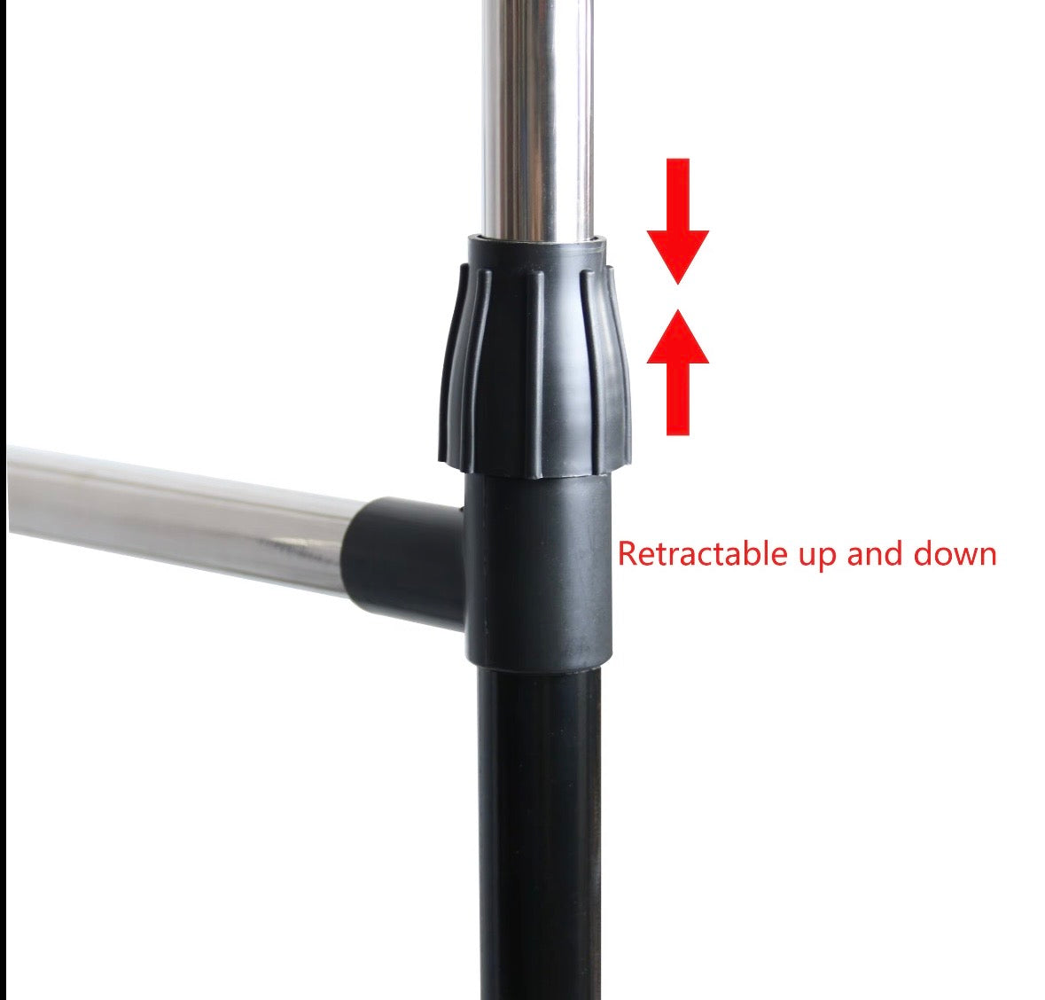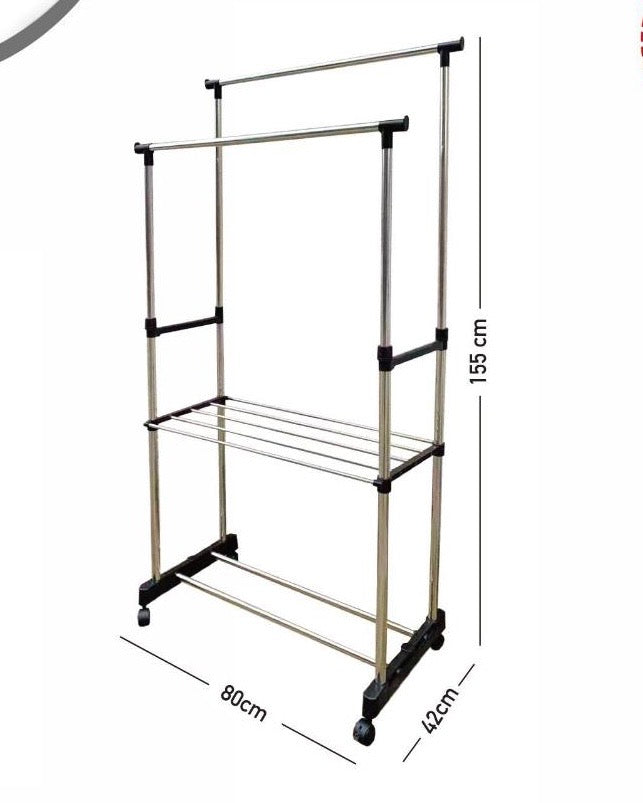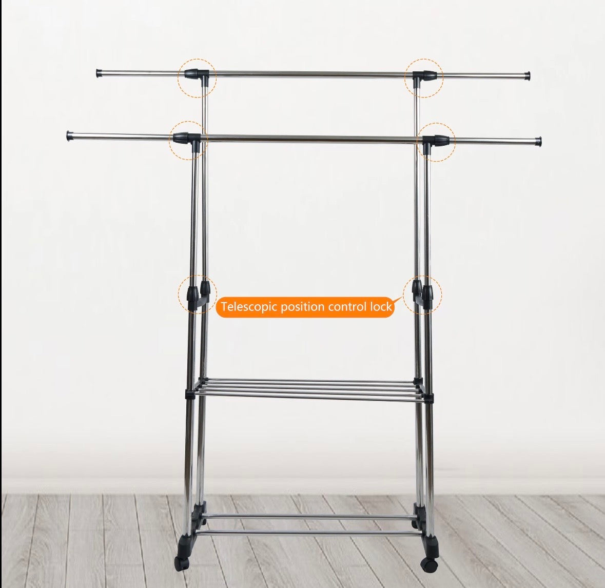 Presentiamo l'appendiabiti doppio binario (o doppio stender) multifunzione, la soluzione ideale per chi ha bisogno di spazio aggiuntivo per i vestiti. Perfetto come guardaroba extra, stand per lavanderia o espositore per negozi. La sua struttura telescopica ti permette di regolare l'altezza e l'ampiezza in base alle tue esigenze!