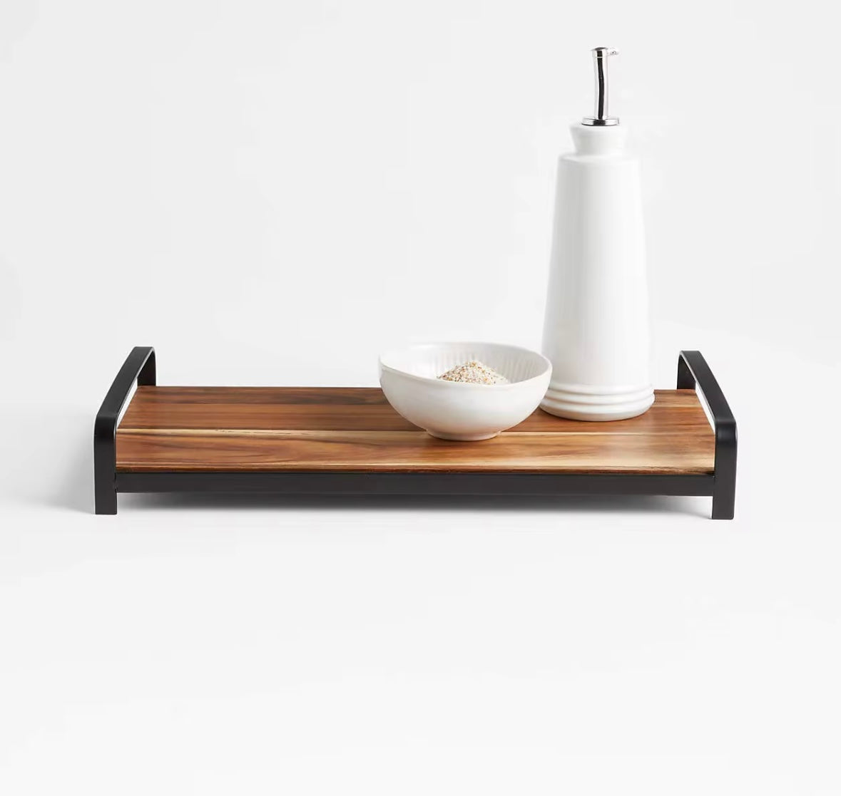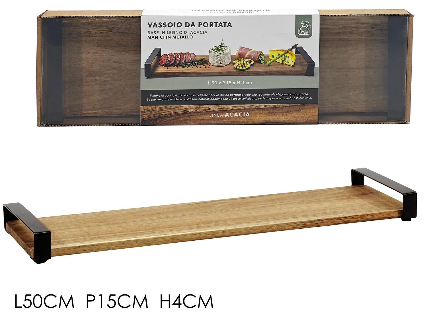 Il legno di acacia naturale non solo garantisce resistenza e durabilità, ma dona anche un tocco caldo ed elegante alla tua tavola. I manici in metallo facilitano il trasporto, rendendo il vassoio pratico e sicuro da utilizzare.